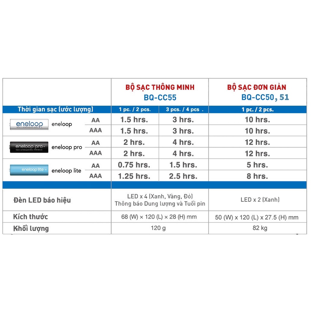 - BQ-CC55 sạc được cả pin Eneloop AA (pin tiểu) và Eneloop AAA (pin đũa), từ đó giúp bạn tiết kiệm chi phí khi mua bộ sạc.