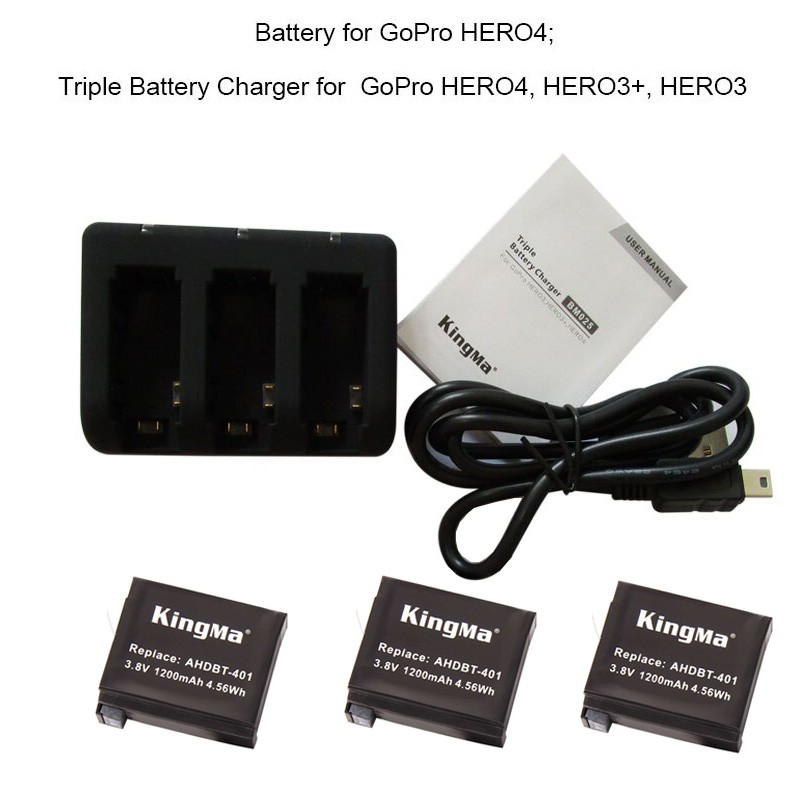 Combo sạc 3 + 3 viên pin Kingma cho GoPro Hero 4- Sạc 3 có thể sạc 3 viên pin GoPro Hero 3, GoPro Hero 4 cùng một lúc.