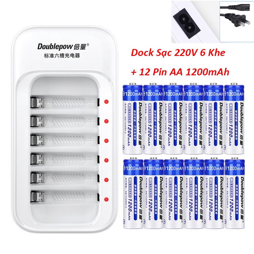 Combo Sạc 6 Khe và 12 Viên Pin Sạc AA NiMh Doublepow 1200mAh MiCro Karaoke Đồ Chơi Trẻ Em