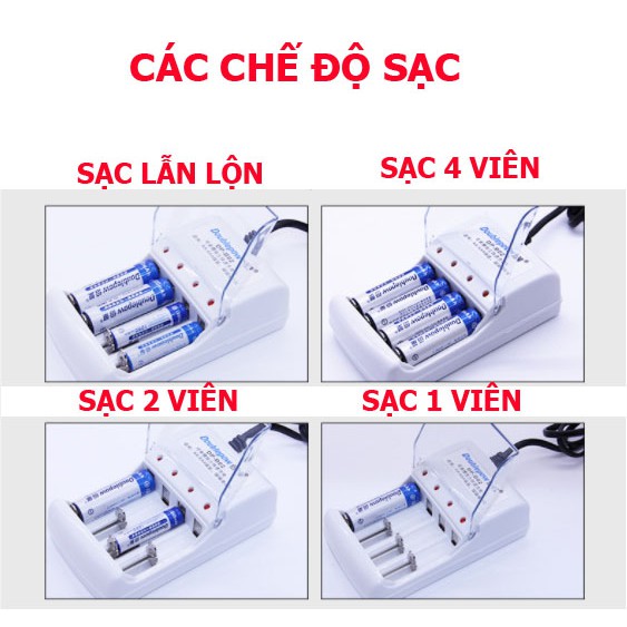 + Các loại pin sạc nhiều lần (pin doublepow, pin panasonic loại sạc lại... ) đều có thể dùng sạc này.