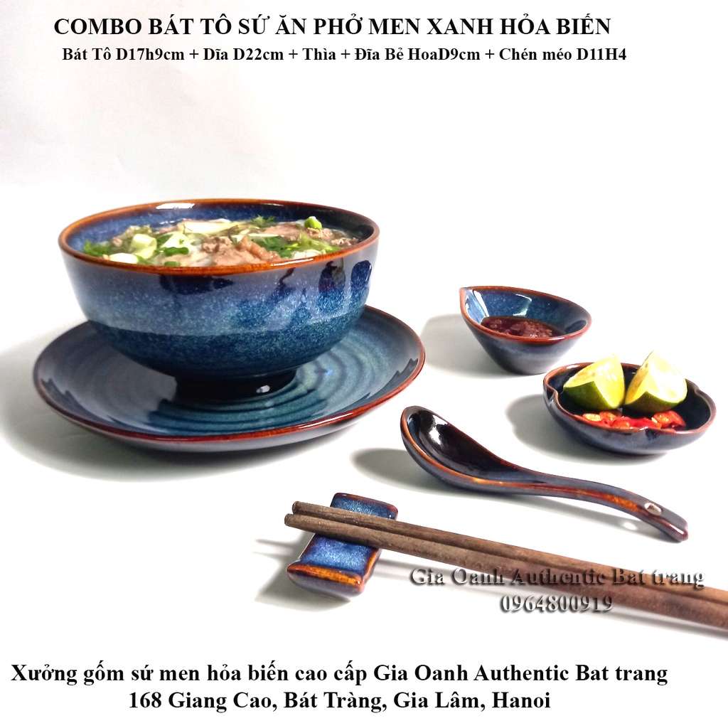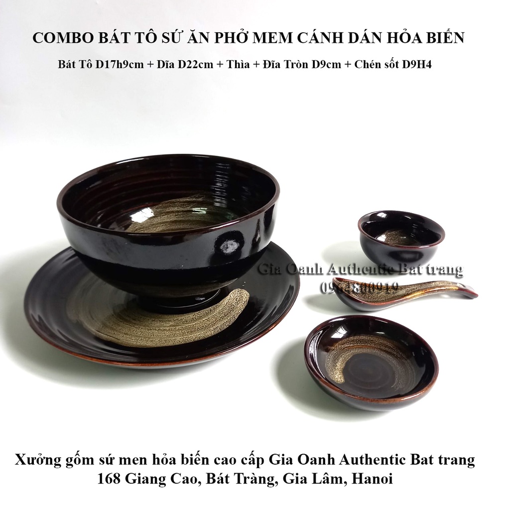 (COMBO) Set bát tô ăn phở - men hỏa biến cao cấp - Tô sứ D17h9+Dĩa D22+Chén Sốt+đĩa ớt tỏi Gia Oanh Authentic Bat trang