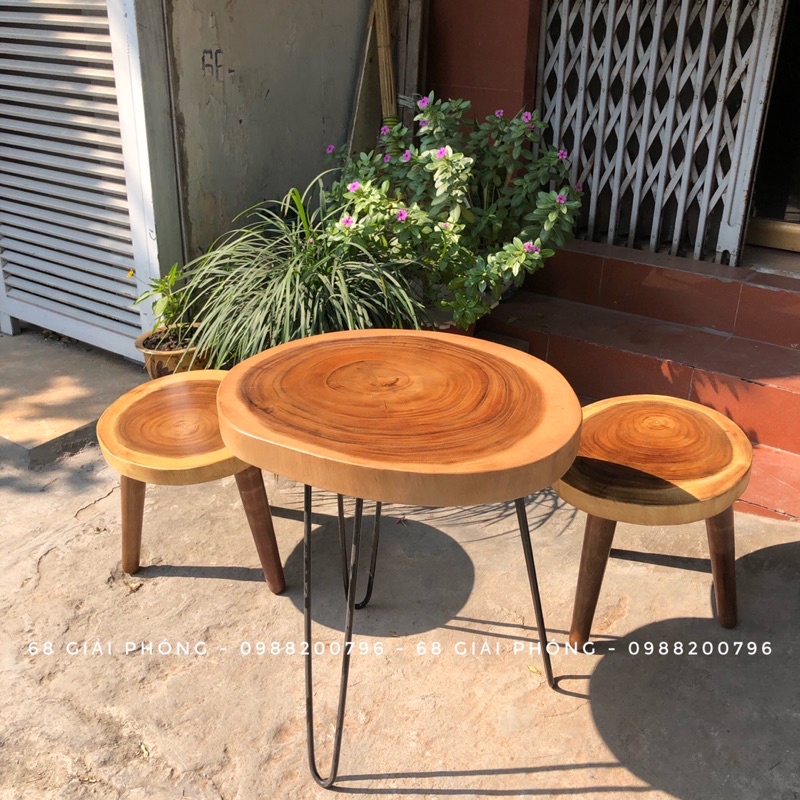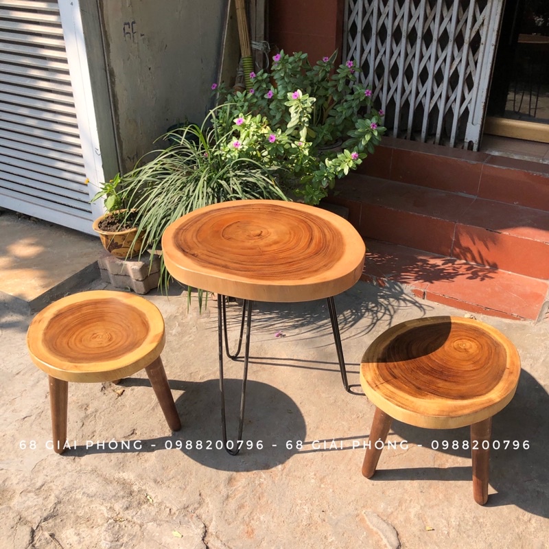 Bộ 2 ghế me tây tự nhiên kết hợp với bàn gỗ me tây nguyên tấm-Kích thước ghế: Đường kính 35-40, chân gỗ cao 30cm