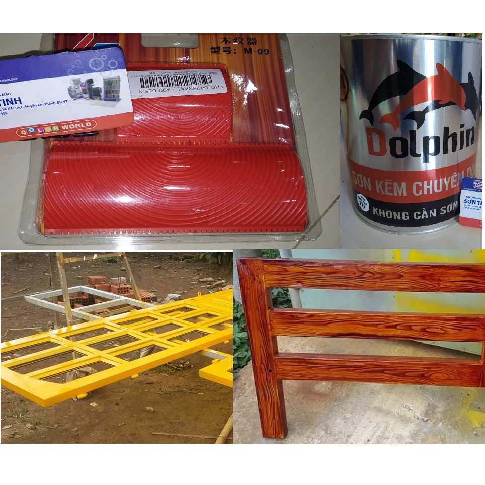 Combo sơn giả gỗ Dolphin bao gồm 3 loại sản phẩm: 1 Bộ sơn 2 thành phần cho sắt mạ kẽm màu vàng(1kg) để sơn lấy nền + 1 Bộ bóng Cánh gián Dolphin hoặc Inter của motokieu (1kg) 1K để tạo vân gỗ và phủ bóng sau khi tạo vân.