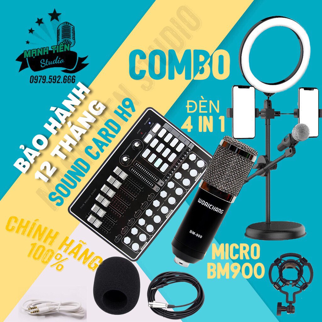 Combo Sound Card H9 + Micro BM900 - Đèn Livestream 4 in 1- thu âm, hát karaoke gia đình, livestream bán hàng,quay tiktok
