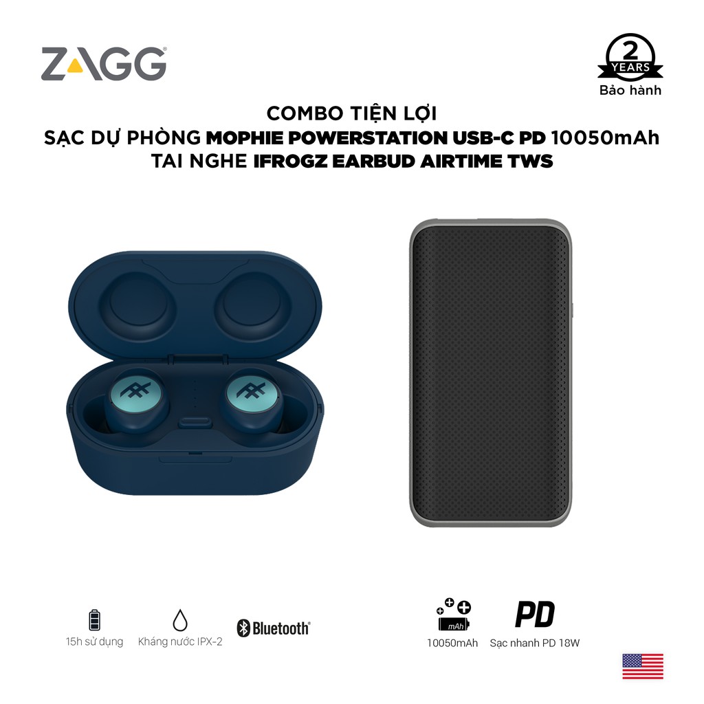 Combo: Tai nghe iFrogz earbud không dây Airtime - Sạc dự phòng Mophie Powerstation USB-C Power Delivery 10050mAh