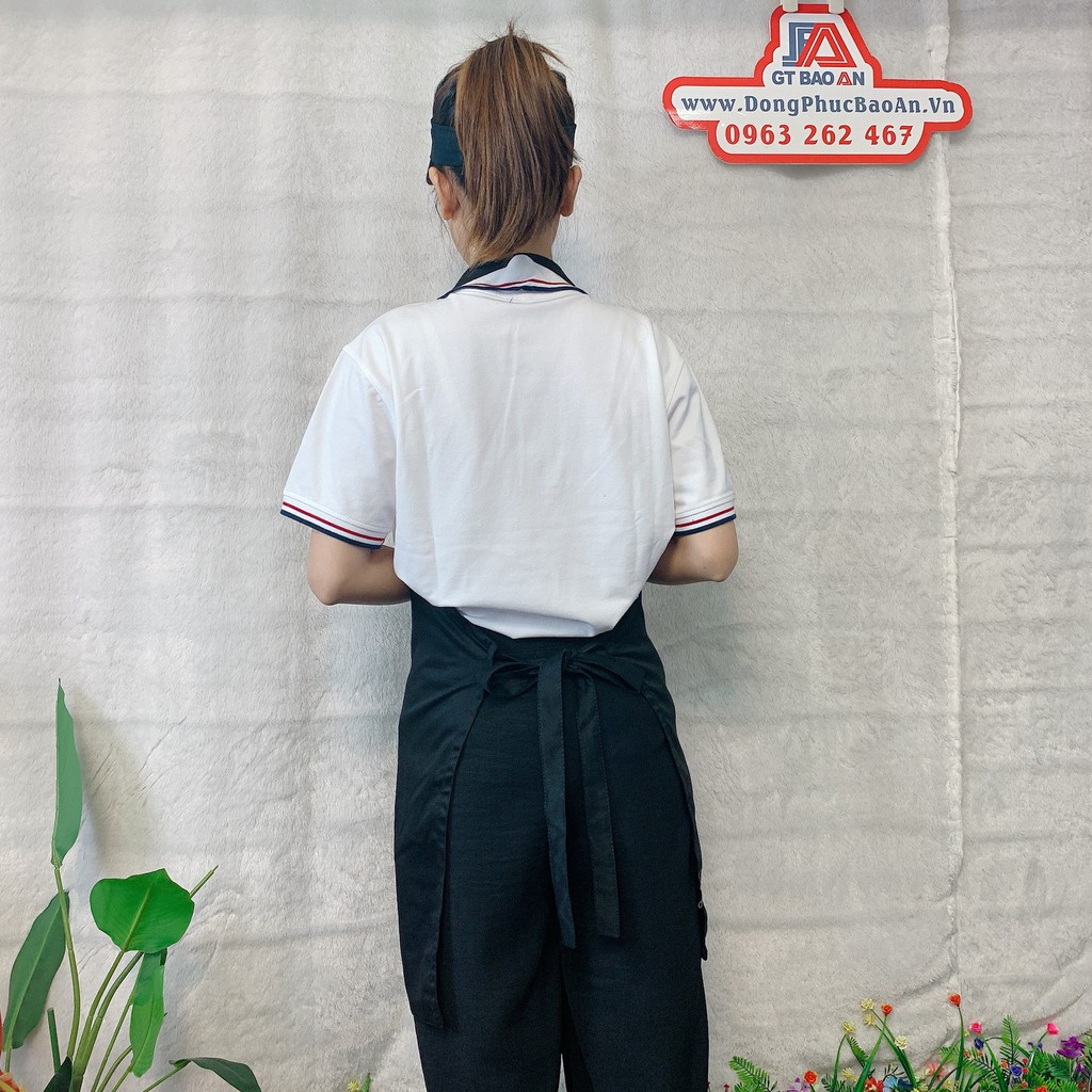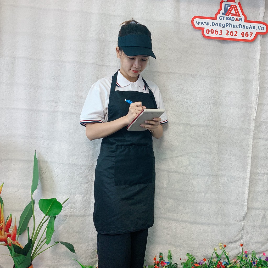 + Tạp dề dài dạng yếm, đeo cổ, có dây cột phía sau, 1 túi phía trước đựng sổ order hoặc các vật dụng hỗ trợ cần thiết. Các đường may kỹ lưỡng, đảm bảo độ bền cao