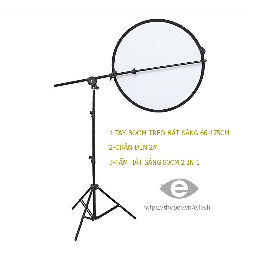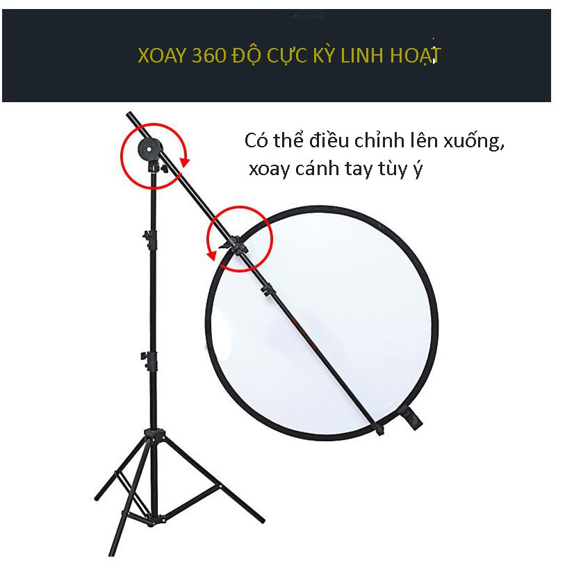 Bộ combo tay treo tấm hắt sáng (phản quang) bộ đầy đủ gồm:1 – Tripod (chân đèn) cao tối đa 2m, trọng lượng 800g. Có thể thu gọn.