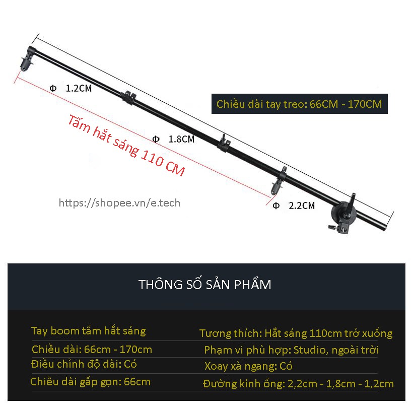 2- Tay treo tấm hắt sáng chiều dài từ 66 – 170cm, có thể điều chỉnh độ dài thích hợp.