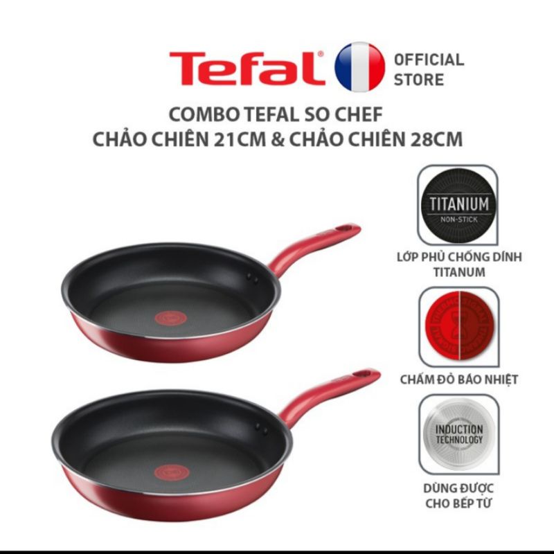 Combo Tefal So Chef Chảo chiên 21cm & Chảo chiên 28cmNấu ăn dễ dàng hơn nhờ tương thích với mọi mặt bếp, kể cả bếp từ. Cùng với lớp phủ chống dính Titanium giúp thức ăn sẽ không bị dính vào chảo. Chấm đỏ báo nhiệt thông minh cho bạn biết nhiệt độ lý tưởng bắt đầu nấu. Kết hợp mặt đế từ giúp thức ăn chín đều hơn.