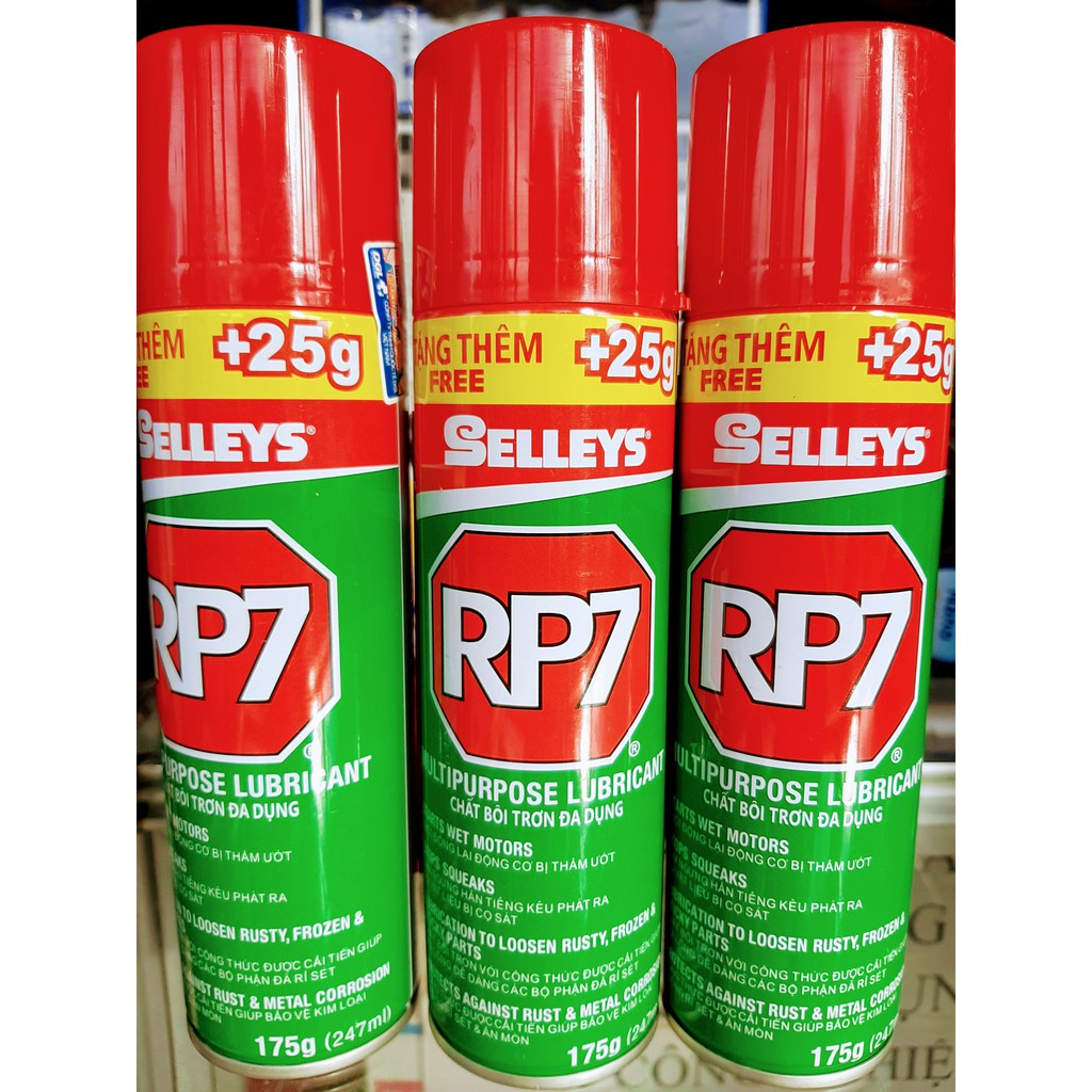 - Dầu chống rỉ sét RP7 được cung cấp dưới dạng chai xịt đa dụng, có tác dụng chống rỉ (gỉ) sét, bôi trơn, bảo vệ kim loại chống ăn mòn,… Đây là một sản phẩm được tin dùng của Selleys (Úc), là một hỗn hợp gồm một loại dầu cao cấp dễ thấm nhờn, đươc chế tạo bằng công thức cải tiến và một hóa chất đậm đặc chống rỉ (gỉ) sét.