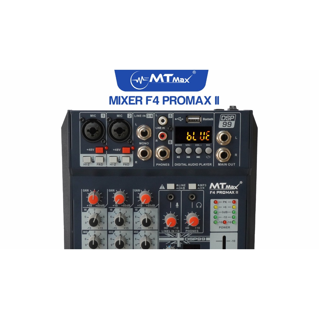 Mixer MTMax F4 ProMax II là dòng sản phẩm mới ra mắt của MTMax, được nâng cấp từ mixer F4 Pro. Tích hợp sẵn 99 chế độ vang số DSP, bộ xử lý âm thanh chuyên nghiệp 16-Bit. MTMax F4 ProMax II thường được sử dụng tại gia đình hoặc show diễn (hội trường) bởi chất lượng ngõ ra âm thanh cực tốt dựa trên những ưu việt của chế độ lọc âm, khuếch đại.