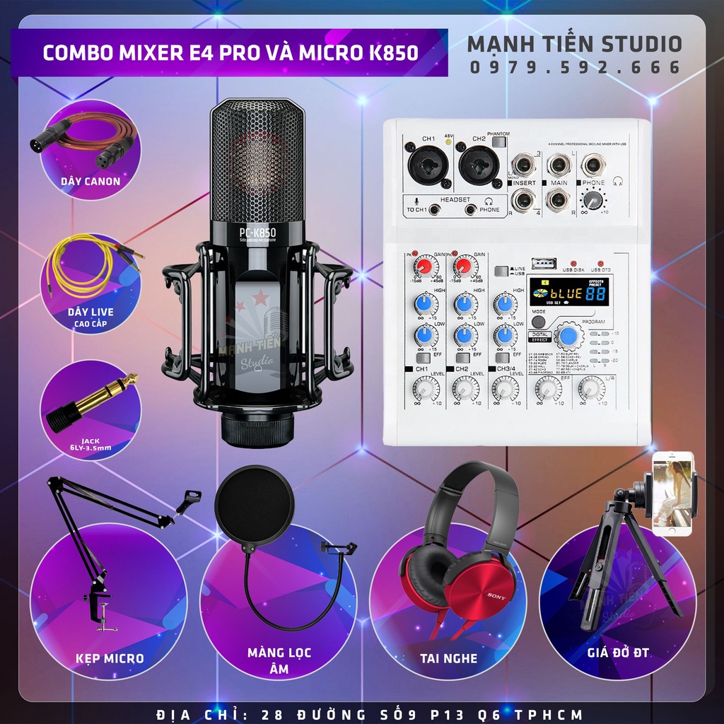 Combo thu âm karaoke livestream đỉnh cao siêu phẩm 2021 Mixer E4 và Micro K850 tặng full phụ kiện bảo hành 12 tháng