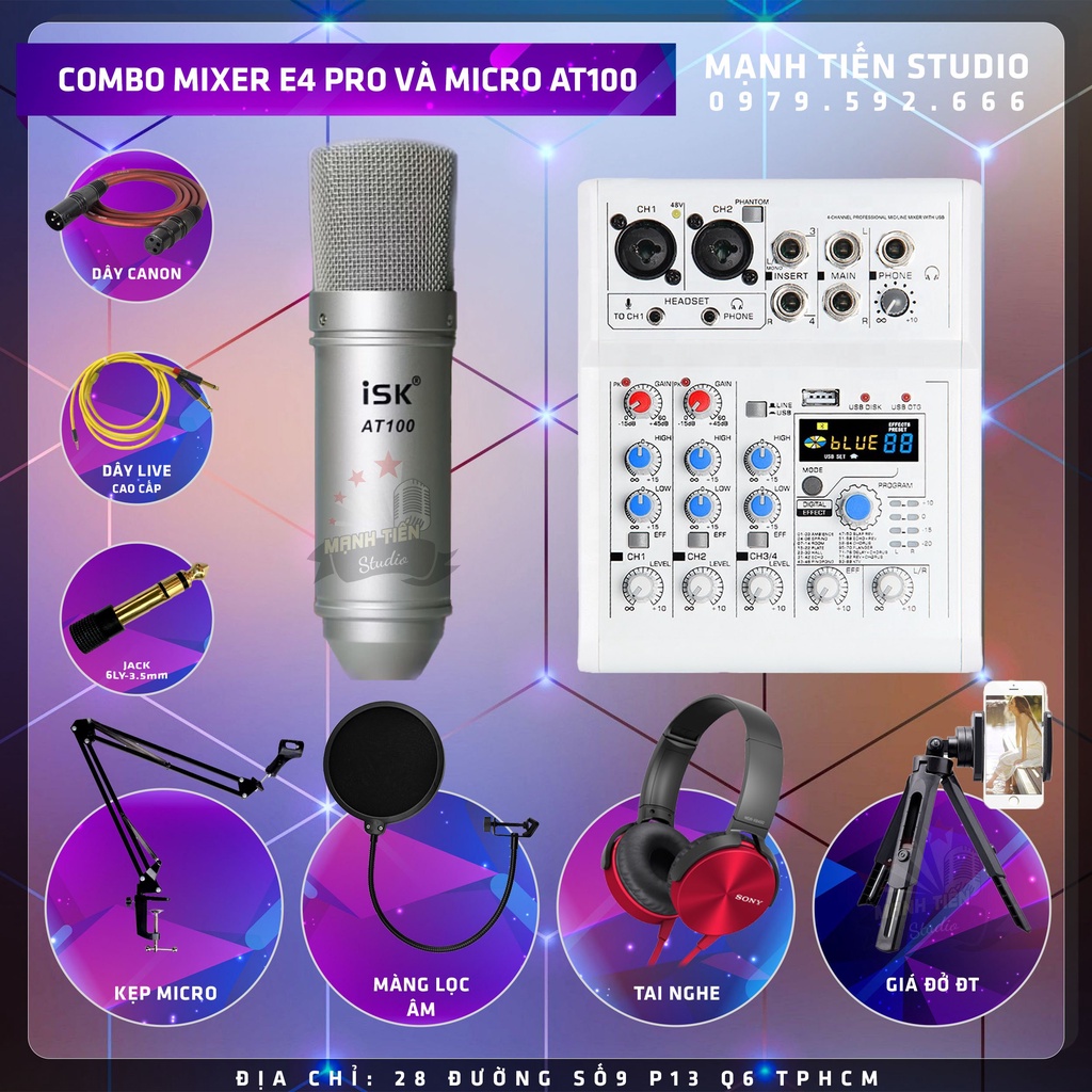 Thiết Bị Âm Thanh > Micro thu âm || Combo thu âm karaoke livestream đỉnh cao siêu phẩm 2021 Mixer E4 và Micro AT100 tặng full phụ kiện bảo hành 12 thángCòn hàng
