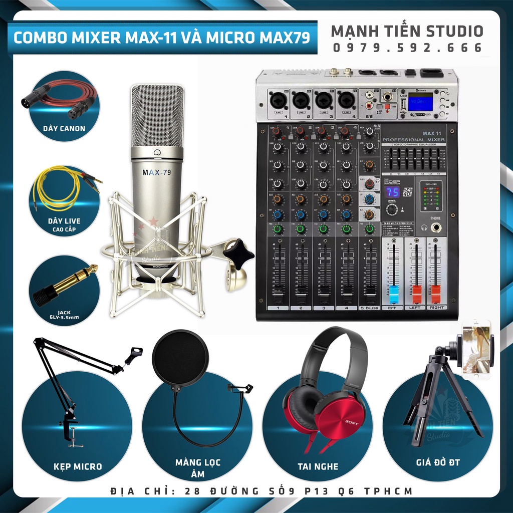 Combo thu âm livestream bán hàng facebook tiktok karaoke chuyên nghiệp Mixer Max 11 Và Micro Max 79 tặng full phụ kiện