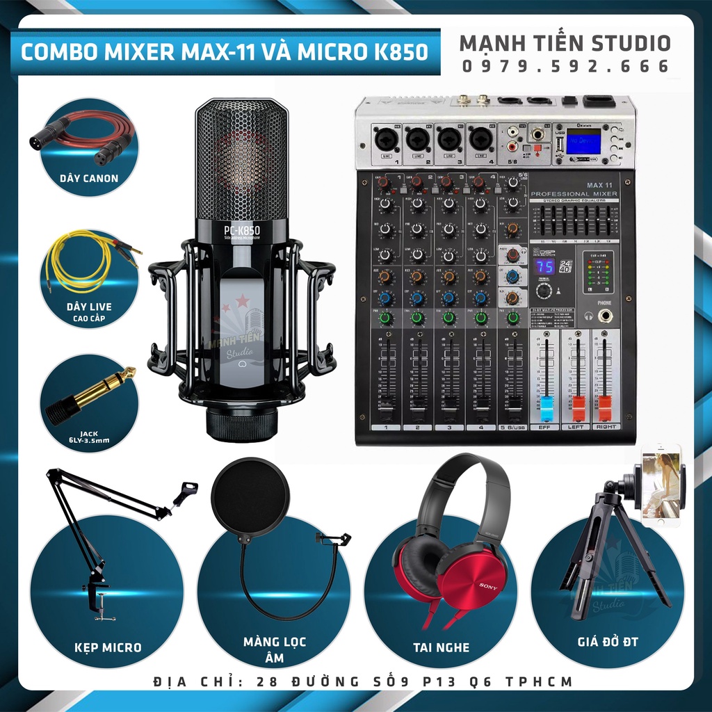 Combo thu âm livestream bán hàng facebook tiktok karaoke chuyên nghiệp Mixer Max 11 Và Micro K850 tặng full phụ kiện