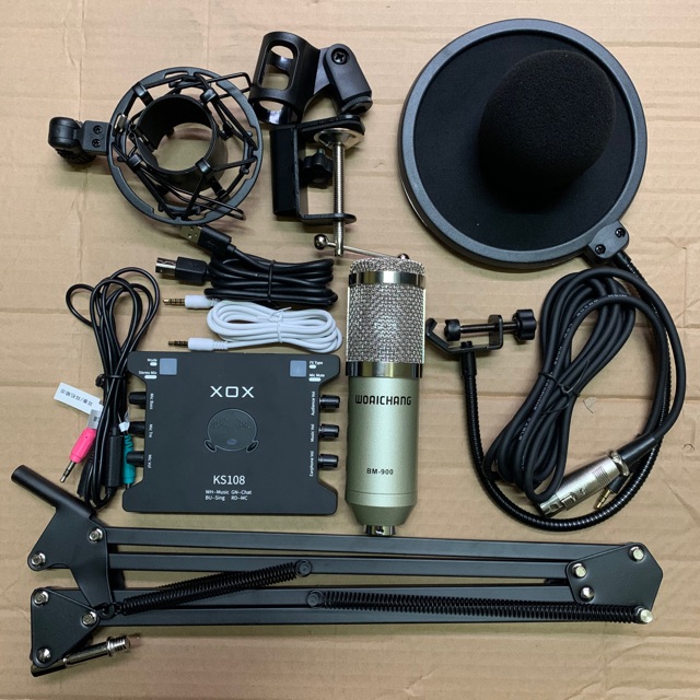COMBO THU ÂM LIVESTREAM MIC BM900-SOUND CARD XOX KS108 mới nhất chân kẹp mic màng lọc
