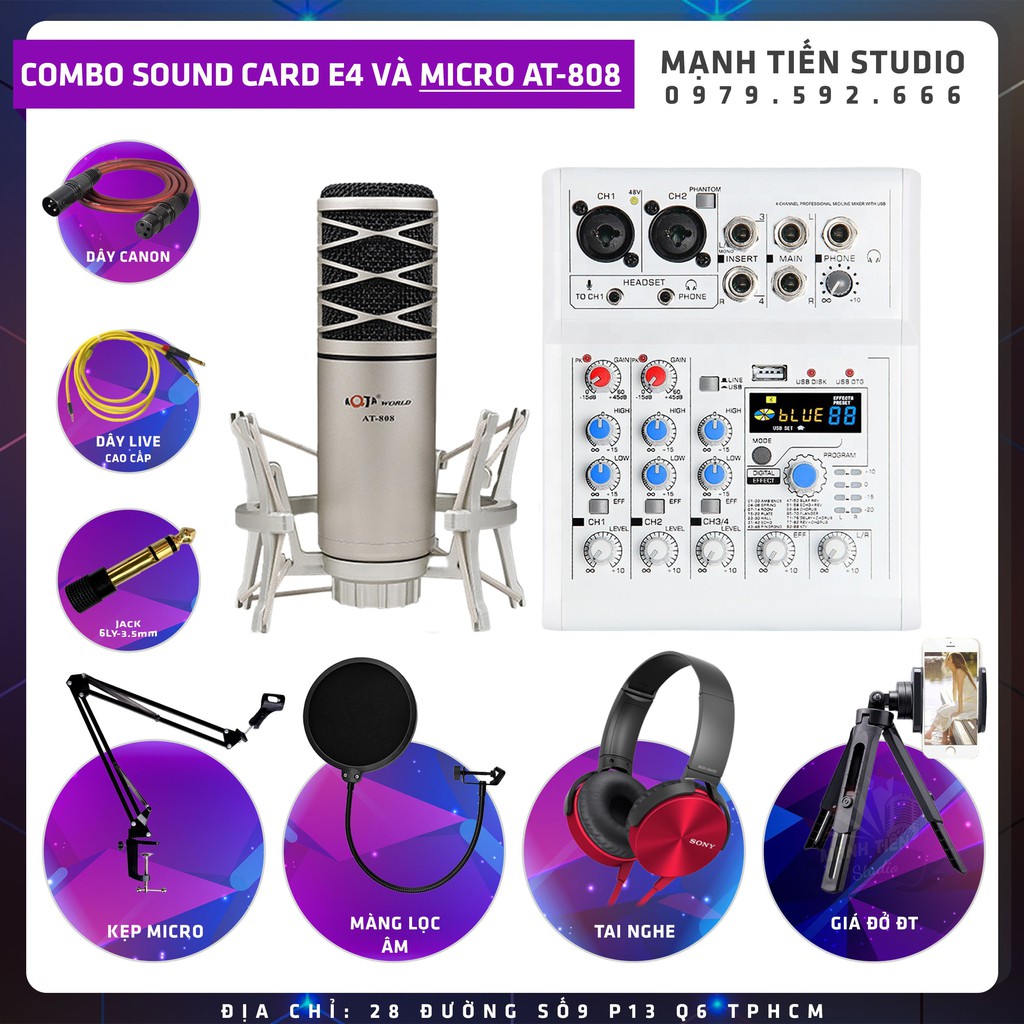 Giới thiệu Combo thu âm, livestream Micro AQTA AT-808, Mixer E4 - Kèm full phụ kiện kẹp micro, màng lọc, tai nghe, dây live chế....