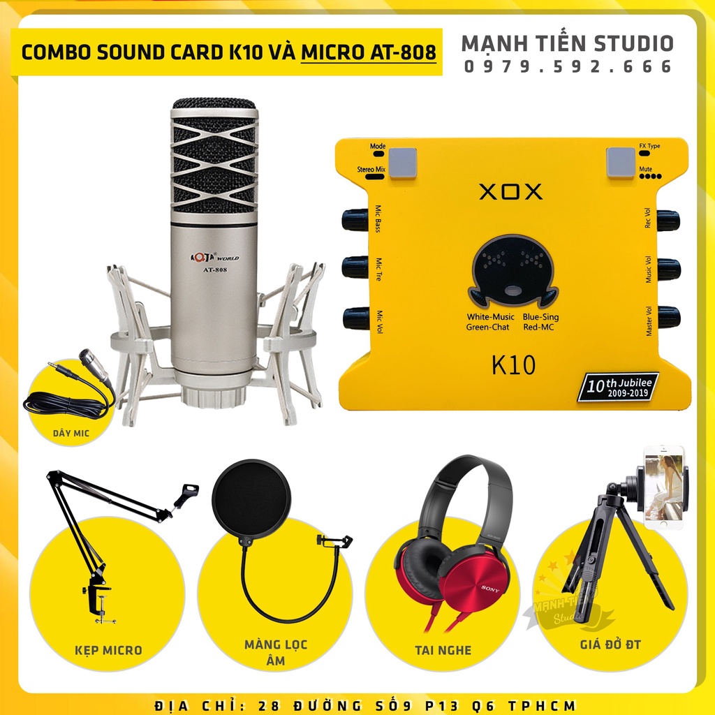 Combo thu âm, livestream Micro AQTA AT-808, Sound card XOX K10 Jubilee - Kèm full phụ kiện kẹp micro, màng lọc, tai nghe