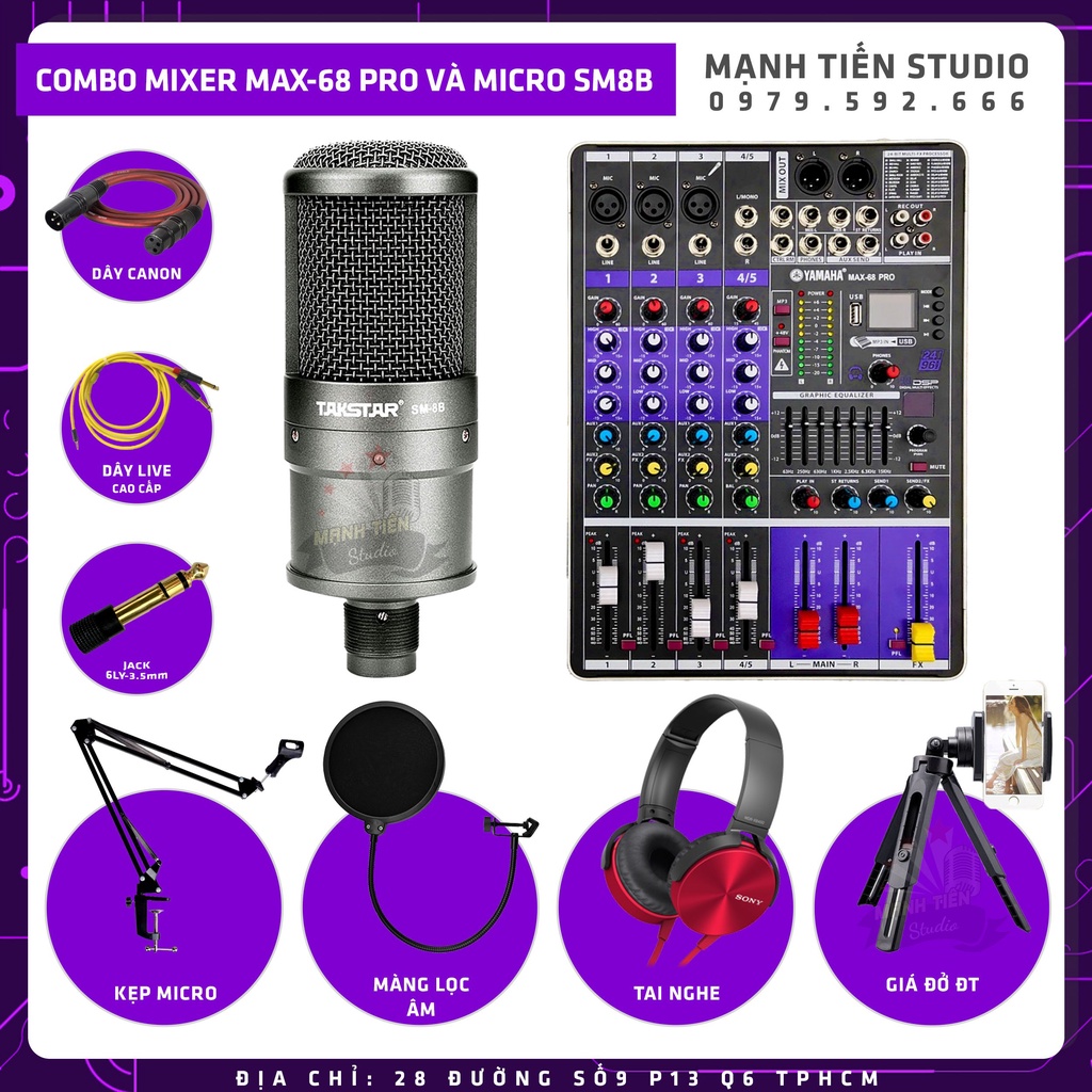 Combo thu âm livestream karaoke đỉnh cao MIXER MAX68 Bluetooth Và Micro SM8B siêu cấp chuẩn âm như phòng thu chất lượng