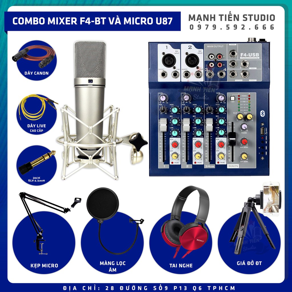 Combo thu âm livestream karaoke bán hàng onl tiktok idol bigo cctalk MIXER F4 Bluetooth Và Micro U87 tặng full phụ kiện