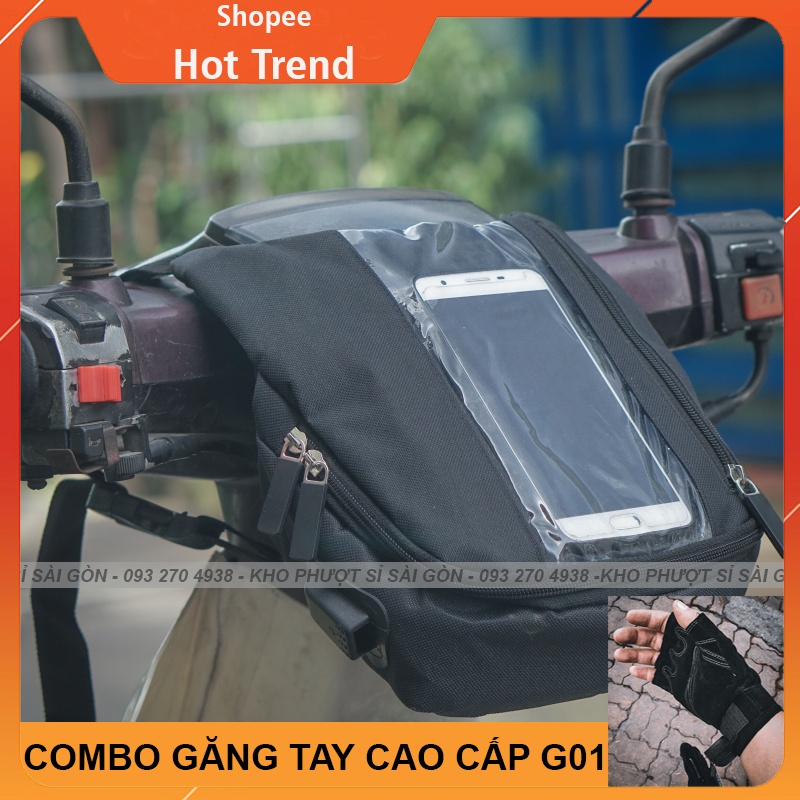 COMBO túi treo đầu xe máy đựng điện thoại cảm ứng chiều đứng kèm găng tay xe máy Swat G01 đen - Túi đựng điện thoại