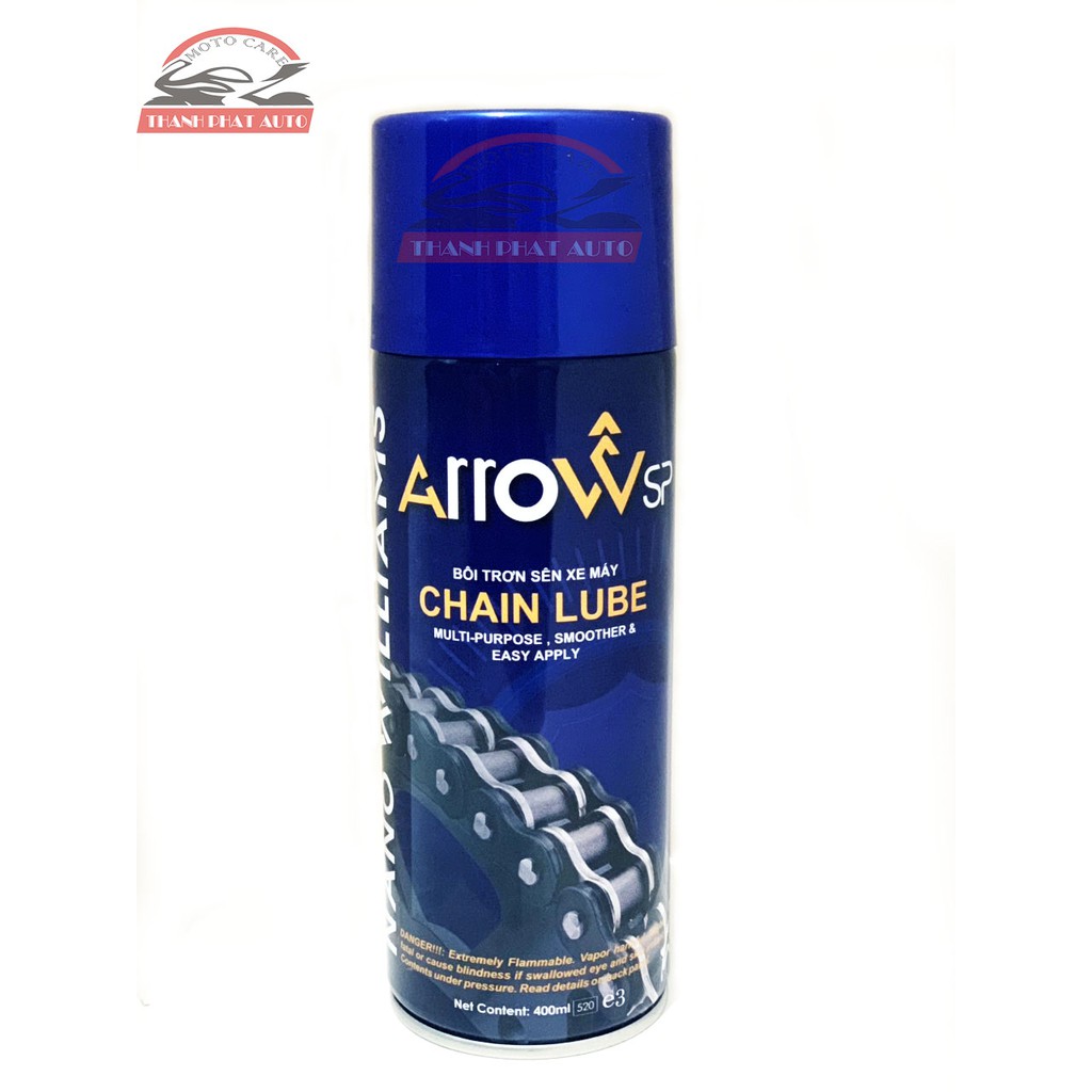 Sản phẩm chai xịt bôi trơn bảo dưỡng sên Chain Lube 400mlARROWsp dùng để bôi trơn giúp cho sên chống lại sự mài mòn giữa các cặp chi tiết tiếp xúccũng như chống oxi hóa do tác nhân bên ngoài môi trường,chống kêu giúp xe vận hành luôn trong trạng thái êm ái.