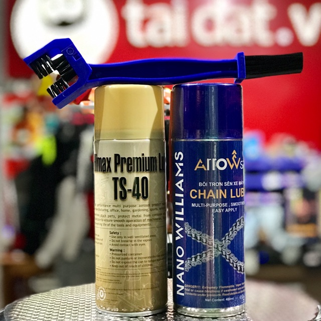 Vệ sinh sên TS40: phá rỉ sét làm sạch kim loại; vệ sinh nhông sên xe máy. Áp dụng Ô tô, xe máy, xe đạp, nhà máy. Thể tích 450ml. Sản xuất Malaysia, đóng gói Hong Kong. Phân phối chính hãng Việt NamBôi trơn sên Arrow: Giúp bôi trơn sên xe máy dạng xịt. Sản xuất tại Việt Nam. Thể tích 400ml