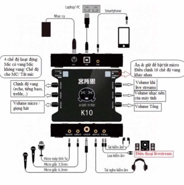 combo bộ sản phẩm gồm sounncard k10( đã có dây kết nối điện thoại 3.5mm và dây nguồn cấp ) và dây livestream ma2Âm thanh tiêu chuẩn 24bit/ 48k Hz