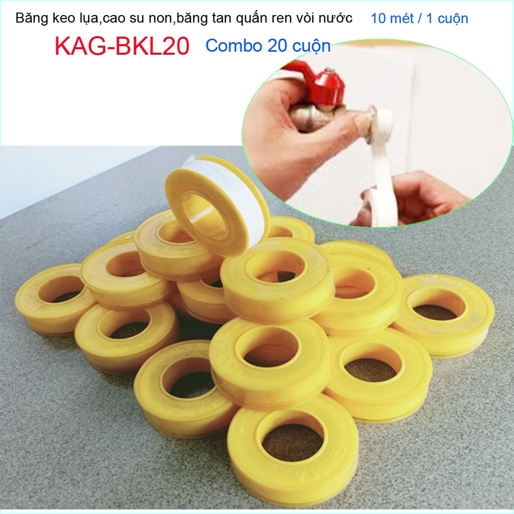 Combo20 hộp băng keo lụa 10m, Combo 20 cuộn cao su non 10 meters quấn ống nước KAG-BKL20 ( 1 cuộn dài 10m- 10 meters long)Băng keo lụa ( cao su non) làm bằng vật liệu PTFE có hàm lượng cao su cao có tác dụng làm kín mối ren, ngăn chặn sự rò rỉ chất lỏng ở nhiệt độ 10-58 độ ( nước, dầu, nước thực phẩm) ...