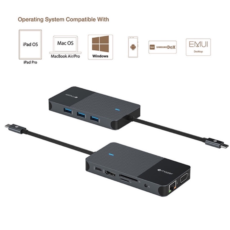 Biến một kết nối USB-C duy nhất thành 10 cổng (4K30Hz HDMIX1, VGA FULL HD1080PX1, Cổng Gigabyte LANX1, 3 x USB-A 3.0, Khe cắm thẻ nhớ Micro SD / SD, Giắc cắm âm thanh 3,5 mm và Cổng sạc USB-C 100W)