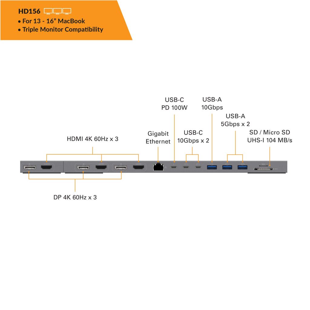 Mở rộng kết nối Macbook 13 ”-14” của bạn với 13 cổng bao gồm HDMI 4K 60Hz x 2, DP 4K 60Hz x 2, khe cắm MicroSD / SD, 1Gb Ethernet, USB-C 10Gbps x 2, USB-C PD 100W, USB-A 10Gbps x 1 và USB-A 5Gbps x 2.