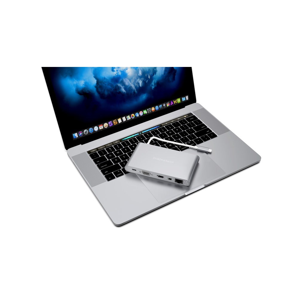 - Bao gồm 11 cổng kết nối: VGA , HDMI 4K, USB-C, SD, microSD, 3 x USB 3.1, cổng mạng Gigabit Ethernet, cổng Thunderbolt và cổng Tai nghe 3.5