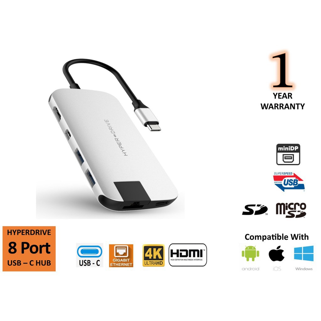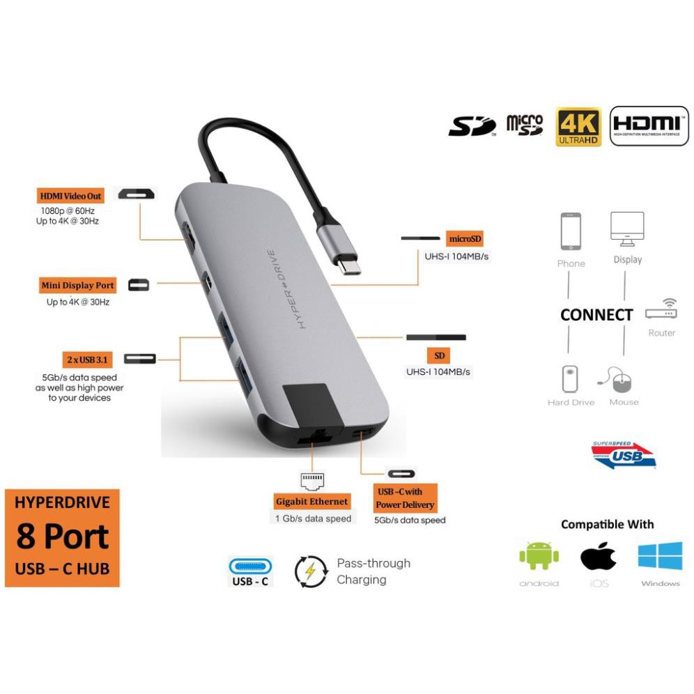 ✔Hub Hyperdrive Slim 8in1 hỗ trợ xuất từ cổng USB-C của Macbook,Untralbook,Chromebook,PC ra các cổng: