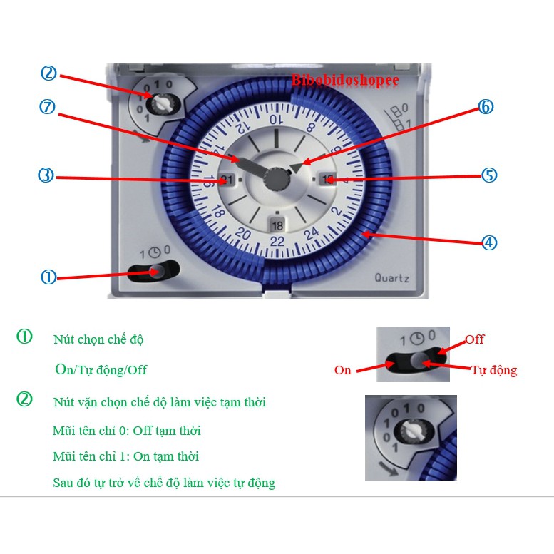 Thời gian đóng ngắt tối thiểu 15 phút. Có 96 nấc cài đặt tương ứng với 24 tiếng/ngày. Tiếp điểm ngõ ra gồm 1 NO (thường hở) và 1NC (Thường đóng) làm việc luân phiên.
