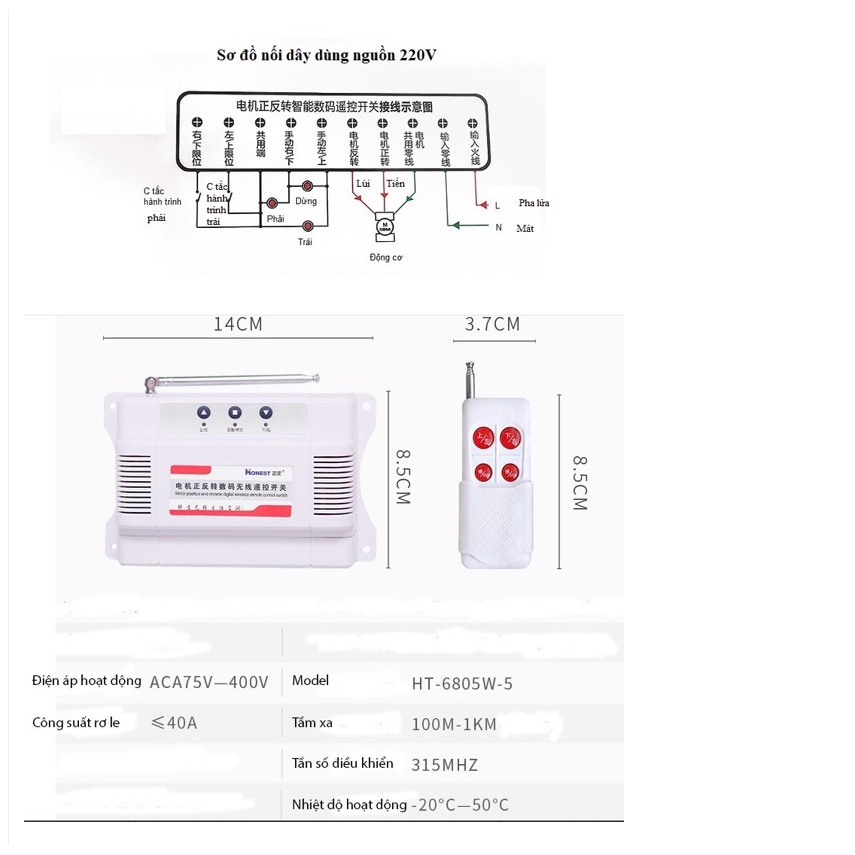 Giới thiệu Công tắc đảo chiều động cơ điều khiển từ xa công suất lớn HT-6805W-5 (AC 75V-400V)-40A tầm xa 1km .Có học lệnh