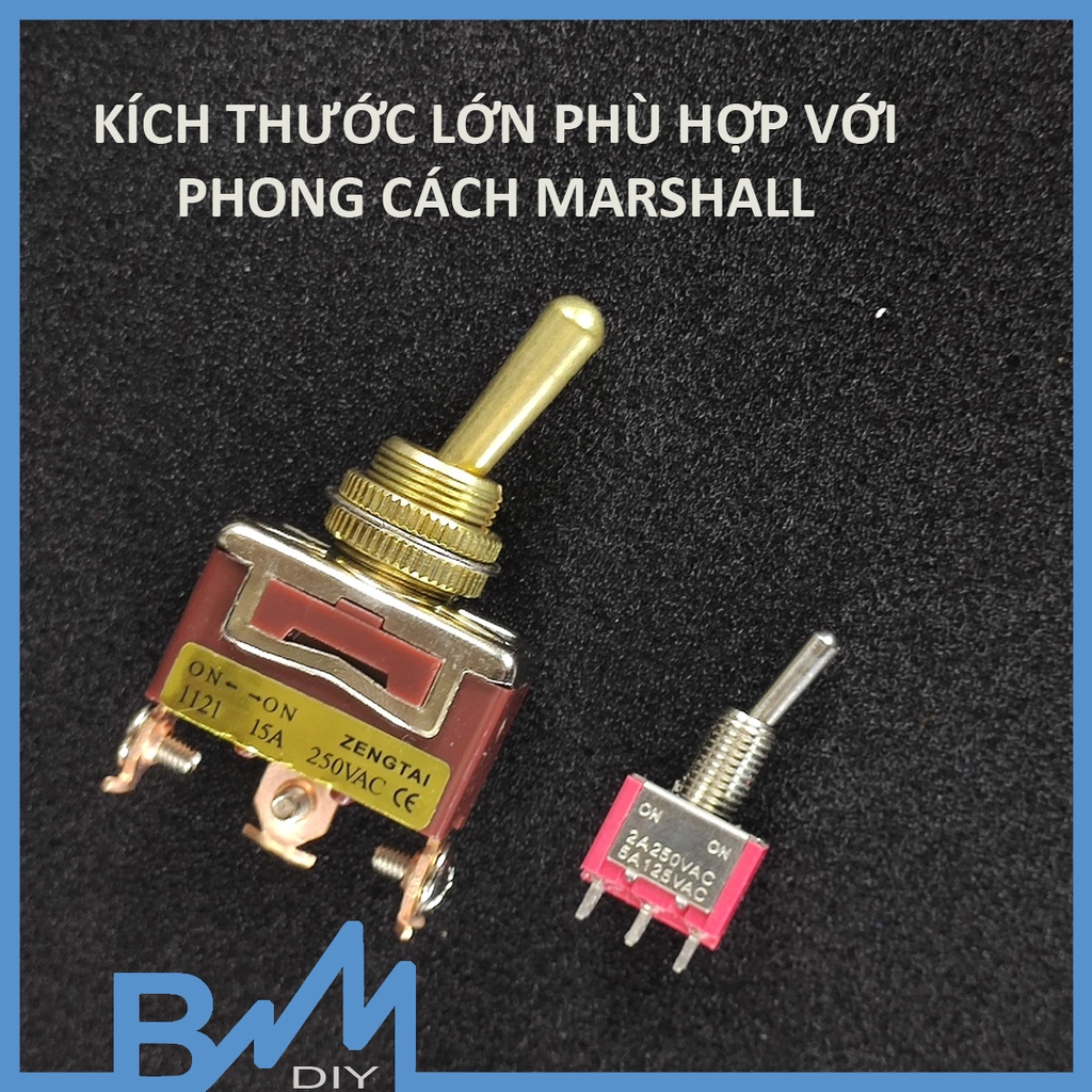 Công tắc gạt với phần tay cầm màu vàng sang trọng luôn là thứ không thể thiếu cho anh em mê phong cách cổ điển, phong cách Marshall... Công tắc có phần tay được làm bằng đồng thau, không bay màu trong quá trình sử dụng. Vỏ công tắc là nhựa chịu nhiệt, tất cả phần dẫn điện được làm từ đồng đỏ, tiếp điểm mạ bạc cho khả năng chịu được công suất cao trong thời gian dài. Ngoài ra công tắc này cho cảm giác gạt rất chắc chắn, dứt khoát, anh em hoàn toàn có thể yên tâm về khả năng đóng cắt, dẫn điện và độ bền của sản phẩm.Sản phẩm là loại lớn, rất vừa mắt khi lắp cùng các núm volume trên mặt control phong cách loa Marshall. Phần ren công tắc khá dài có 2 ốc vít, phù hợp với nhiều độ dày khác nhau của mặt control, có thể lắp trực tiếp qua vỏ loa dày tới 9mm.