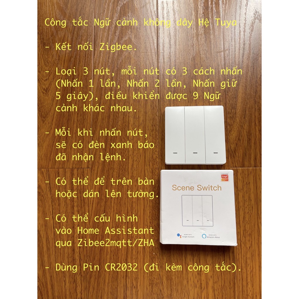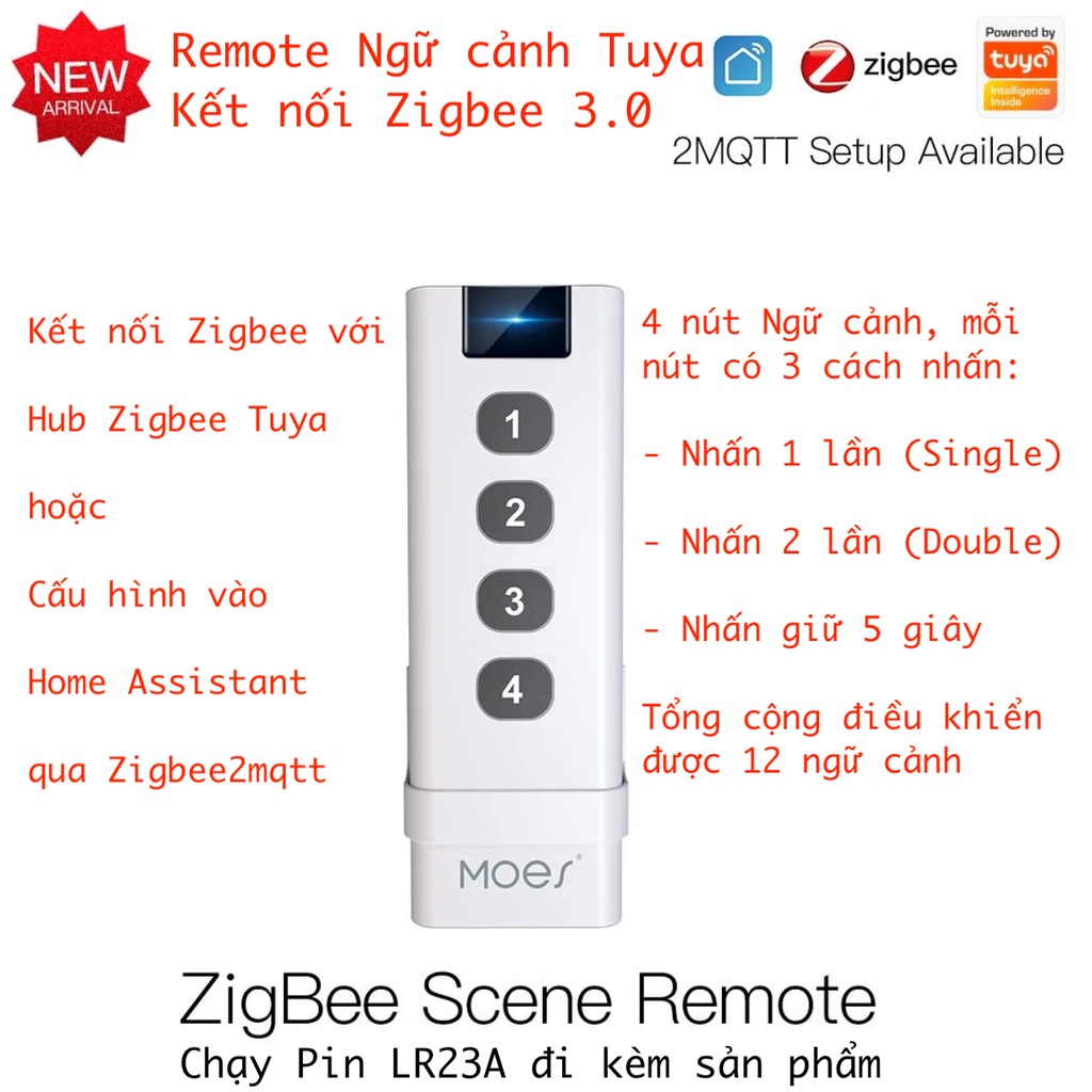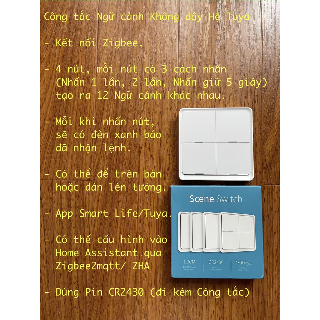 Ghi chú: Nếu Quý khách dùng Hass (Home Assistant), hầu hết công tắc ngữ cảnh 4 nút có mã TS004F khi cài vào Hass (Home Assistant), Quý khách cần nâng cấp (upgrade) Add-on Zigbee2mqtt lên phiên bản 1.22 trở về sau để sử dụng 12 ngữ cảnh (mỗi nút 3 cách nhấn: Single/ Double/ Hold) giống với mã TS0044. Riêng ZHA thì mã TS004F vẫn đang là Dimmer. Các loại công tắc ngữ cảnh 1-nút/ 2-nút/ 3-nút/ Remote 4-nút khác thì thêm vào Hass bình thường.