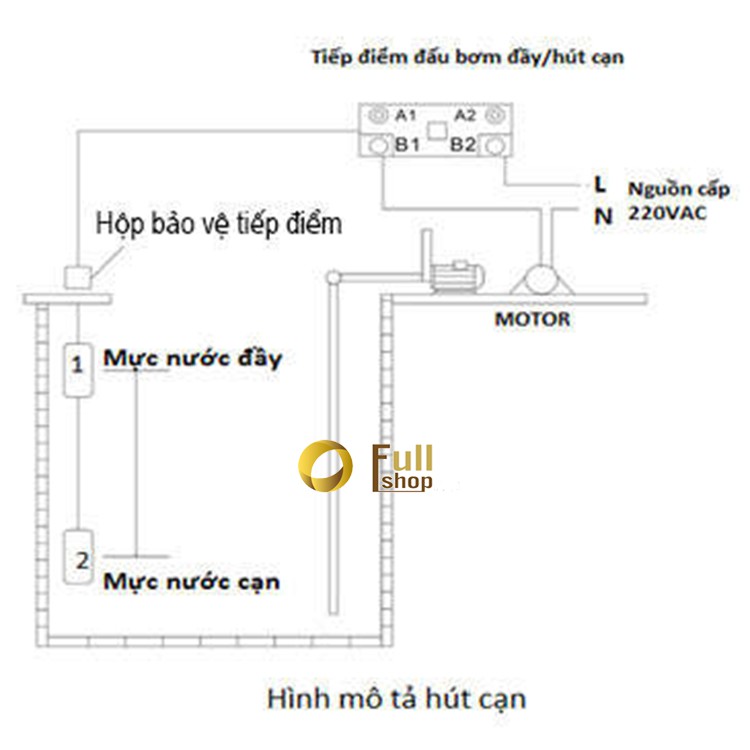 Bơm hút cạn: Khi mực nước trong bồn đến giữa phao 1 thì tiếp điểm điện B1 và B2 mới được tự động đóng lại, và nguồn điện cấp cho bơm. Bơm hoạt động thì mực nước trong bồn hạ xuống đến mực nước cạn tại điểm giữa phao 2 thì tiếp điểm điện B1 , B2 sẽ tự động ngắt máy bơm ngừng hoạt động (Bơm cạn tự ngắt)