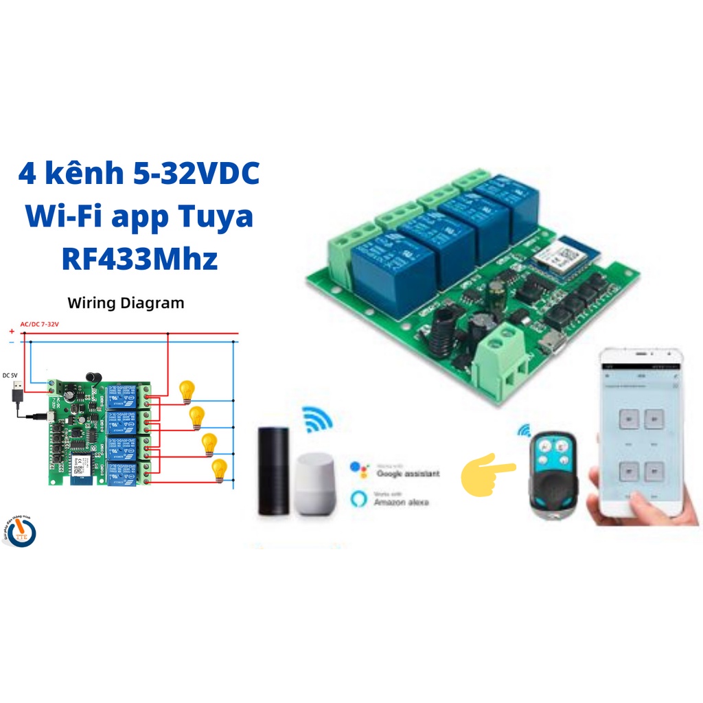 Thiết Bị Điện Gia Dụng > Thiết bị điều khiển từ xa || Công tắc thông minh 4 kênh 5-32VDC kết nối Wi-Fi app Tuya Smartlife, 433Mhz điều khiển từ xaCòn hàng