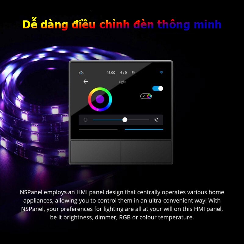 - NSPanel sử dụng thiết kế bảng điều khiển HMI sử dụng tập trung các thiết bị gia dụng khác nhau, cho phép bạn điều khiển theo cách cực kỳ tiện lợi! Với NSPanel, sở thích của bạn về ánh sáng là tất cả tùy ý trên bảng điều khiển HMI này, có thể là độ sáng, độ mờ, RGB hoặc nhiệt độ màu.