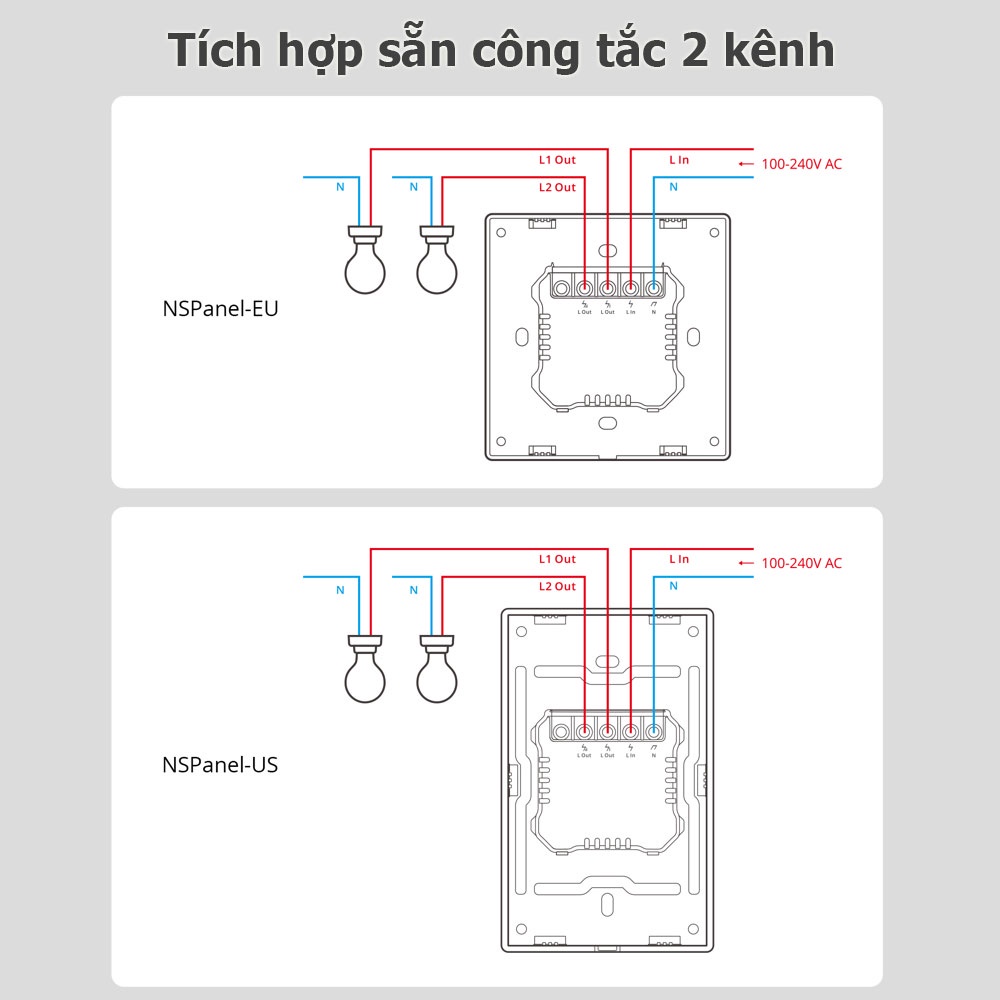 - Kích thước: NSPanel-EU: 86x86x41.7mm, NSPanel-US: 120x74x41.7mm