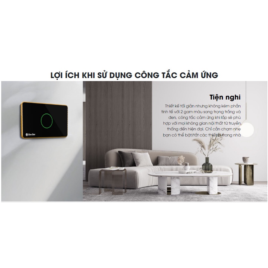 Thiết kế tối giản nhưng không kém phần tinh tế với 2 gam màu sang trọng trắng và đen, công tắc cảm ứng khi lắp sẽ phù hợp với mọi không gian nội thất từ truyền thống đến hiện đại. Chỉ cần chạm nhẹ bạn có thể bật/tắt các thiết bị trong nhà