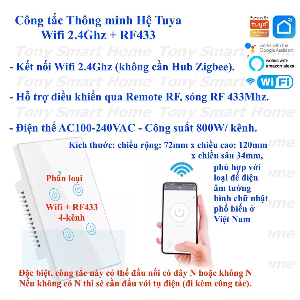 Công tắc thông minh hệ Tuya, Wifi + RF433, App Tuya/ Smart Life -