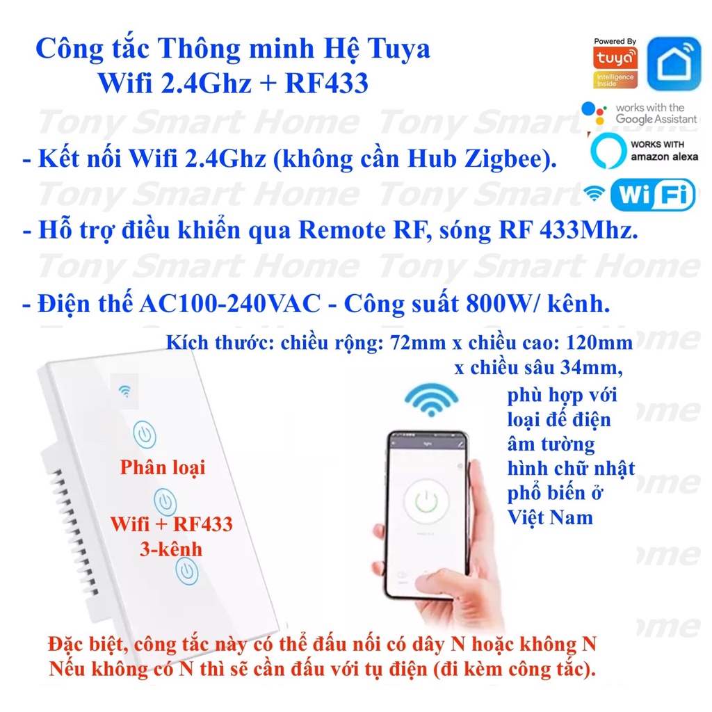 Công tắc thông minh hệ Tuya.- Dùng sóng Wifi + RF 433Mhz.