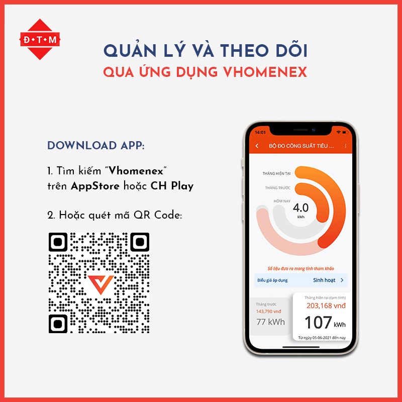 - Giám sát công suất tiêu thụ và số tiền điện liên tục qua màn hình LCD hoặc ứng dụng di động Vhomenex