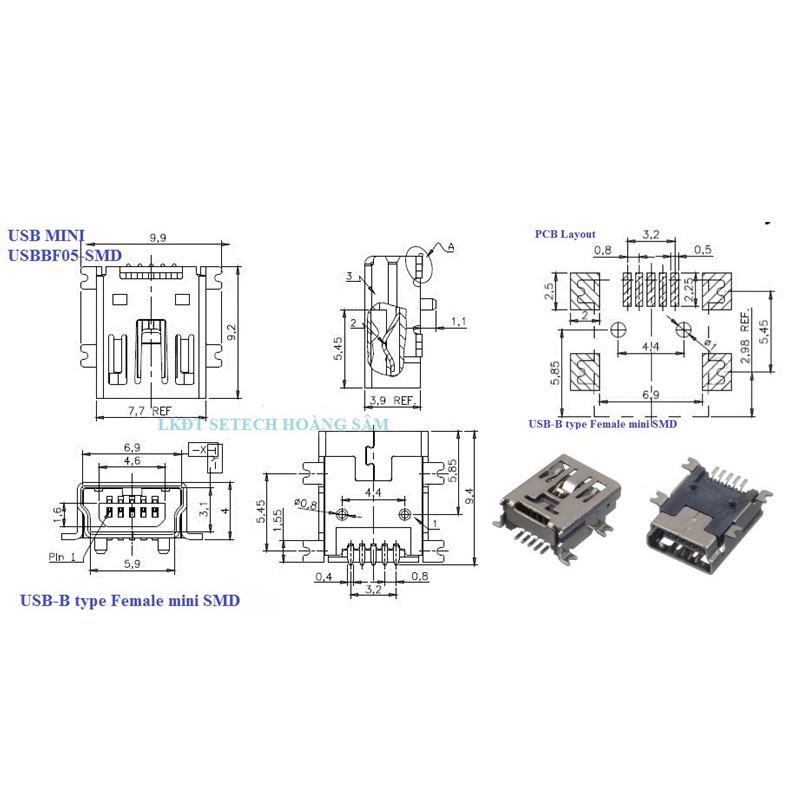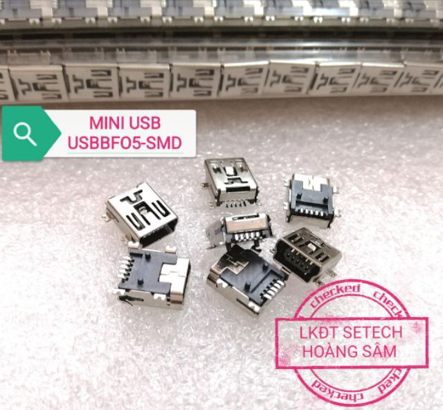 4. Mini USB BF05-SMD: Mini Type B Female (cổng cái) chân dán, 5 chân tín hiệu + 4 chân gá cố định
