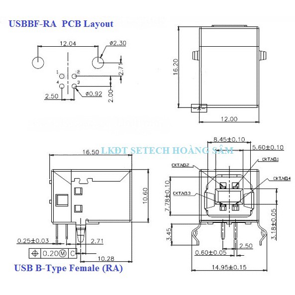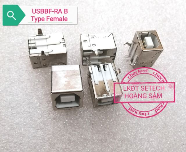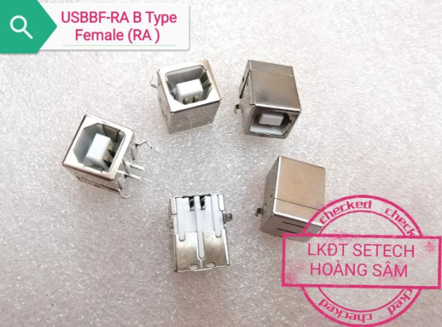 3. USBBF-RA: Type B Female (cổng cái) hay còn gọi cổng máy in (cắm đầu dây máy in), chân cong, 4 chân cong + 2 chân gá cố định