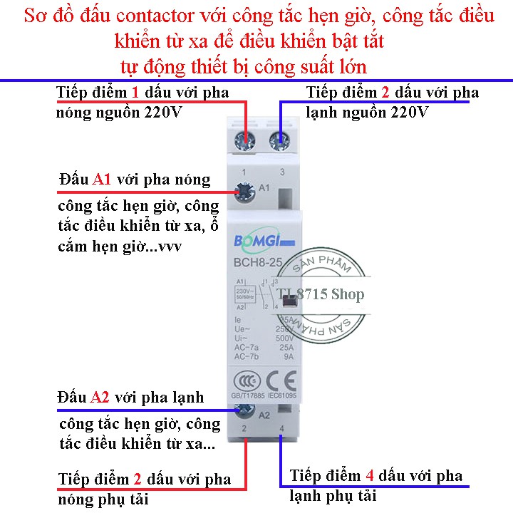 Giới thiệu Contactor 63A/220V 2NO BOMGI mini làm tiếp điểm phụ cho công tắc hẹn giờ, công tắc điều khiển từ xa, công tắc wifi