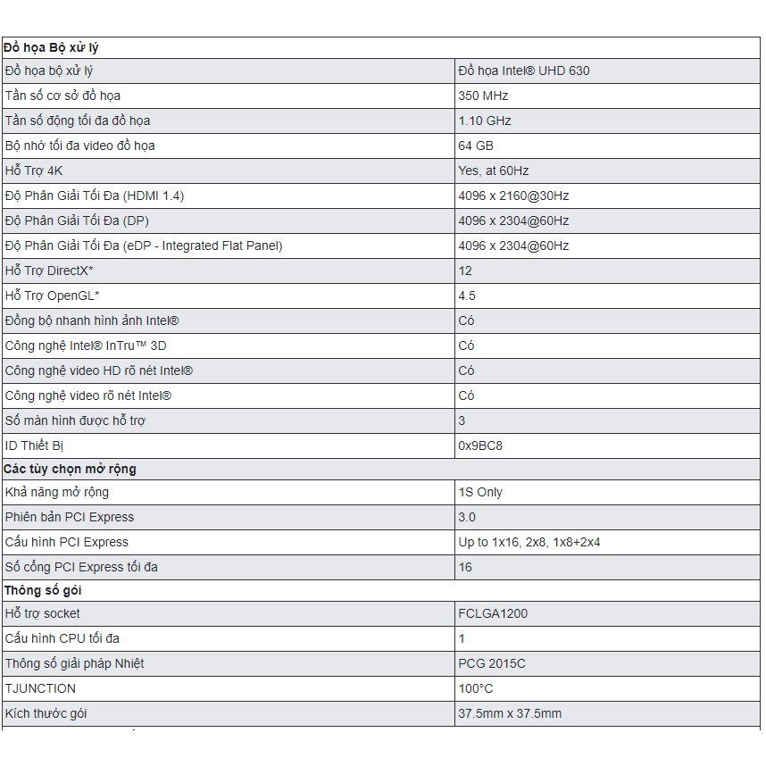 Đồ họa bộ xử lý Đồ họa Intel® UHD 630