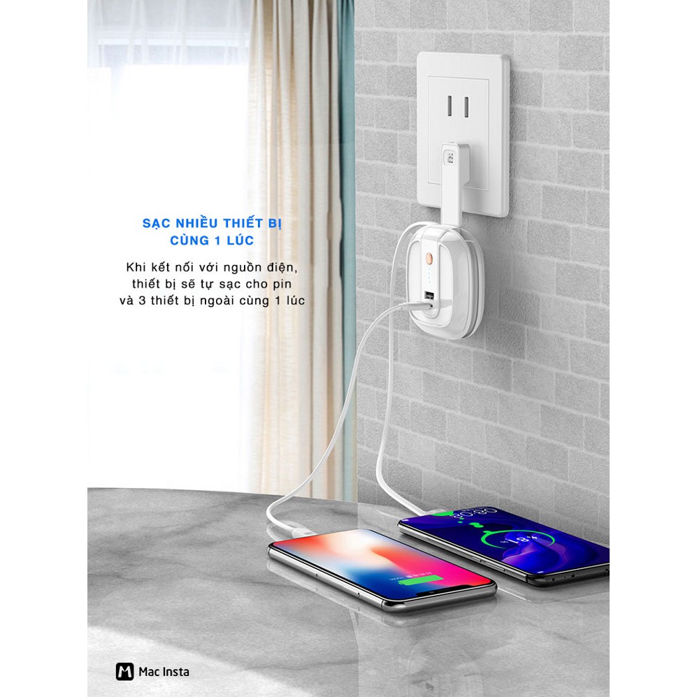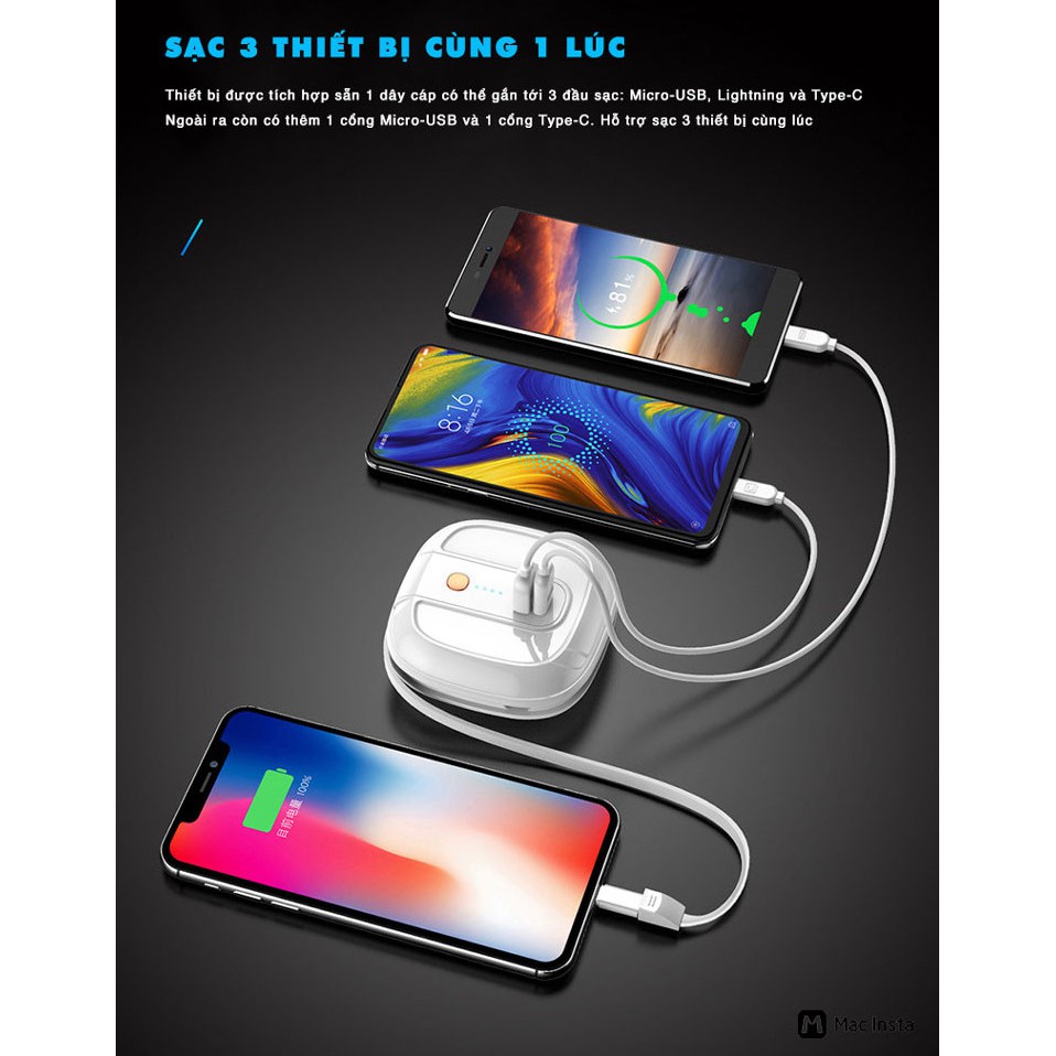 - Tích hợp dây cáp sạc Micro-USB được quấn gọn vào thân thiết bị. Đi kèm với thiết bị là đầu chuyển đổi Lightning, Type-C, với 2 đầu chuyển đổi này, bạn có thể sạc cho mọi thiết bị di động trên thị trường hiện này mà không phải mang theo bất cứ dây cáp nào khác.